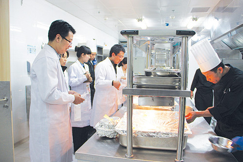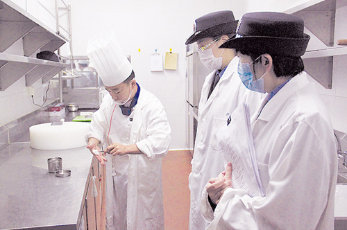 11月4日,北京北辰洲際酒店,一位廚師正準(zhǔn)備進入廚房安全最重要的地區(qū)——冷葷間。關(guān)掉紫外線燈,再在更衣室內(nèi)換好工作服,戴上口罩,拉開消毒毛巾纏繞的門把手,進入這個廚房重地。同樣穿著白大褂、戴著口罩的北京朝陽區(qū)食品藥品監(jiān)管局工作人員楊華和郭競潞,則默默注視著他洗完手后,用鑷子夾出酒精棉球,一絲不茍地擦拭雙手。擦完后,楊華和郭競潞又讓廚師展示了手心手背,看一看手上有無傷口。然后,她們還要查閱紫外線燈的使用記錄本,確保已經(jīng)照射了充足的時間來給整個冷葷間消毒……