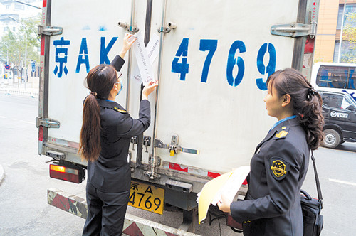 ▲圖為東城區(qū)食品藥品監(jiān)管局監(jiān)管人員在車輛送餐的途中將餐車簽封,以保障送餐全過程安全。何秀文 攝