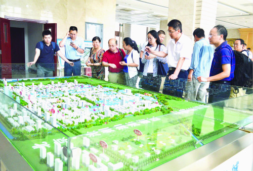 圖為在“北京·滄州渤海新區(qū)生物醫(yī)藥產業(yè)園”沙盤前,園區(qū)相關負責人向北京市食品藥品監(jiān)管局工作人員介紹園區(qū)規(guī)劃建設情況。(孫玲 攝)