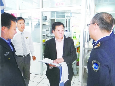 圖為內(nèi)蒙古自治區(qū)烏蘭察布市食品藥品監(jiān)管局執(zhí)法人員檢查餐飲企業(yè)?! ?