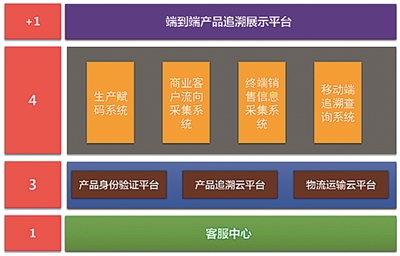 “1”是指建立1個客服中心,對外向商業(yè)客戶、消費(fèi)者提供產(chǎn)品質(zhì)量、用法、真?zhèn)涡畔⒉樵兒头答?,要為客服中心開放必要的追溯系統(tǒng)查詢權(quán)限。“3”是指3個平臺:第一個平臺是指存放追溯系統(tǒng)相關(guān)服務(wù)器、存儲資源的云平臺,定位在IaaS層面;第二個平臺是指多個企業(yè)、多條生產(chǎn)線共用的產(chǎn)品身份驗(yàn)證平臺,定位在SaaS層面;第三個平臺是指物流運(yùn)輸云平臺,定位在SaaS層面?!?”是指要為上述4個關(guān)鍵節(jié)點(diǎn),按照追溯的設(shè)計(jì)原理,建立對應(yīng)的應(yīng)用系統(tǒng),包括生產(chǎn)賦碼系統(tǒng)、商業(yè)客戶流向采集系統(tǒng)、銷售終端信息采集系統(tǒng)、移動端追溯查詢系統(tǒng)?!?1”是指將整個產(chǎn)品追溯系統(tǒng)中涉及的原料輔料包材供應(yīng)商、生產(chǎn)班次、產(chǎn)品規(guī)格、產(chǎn)品追溯碼、包裝追溯碼、商業(yè)產(chǎn)品流向等各類信息,通過一個集成的平臺進(jìn)行匯集、展示和分析(在此我們命名為“端到端產(chǎn)品追溯展示平臺”),在出現(xiàn)產(chǎn)品質(zhì)量問題時,在這個平臺上通過輸入“產(chǎn)品追溯碼”或“包裝追溯碼”,就能以鏈條的方式對產(chǎn)品進(jìn)行銷售時間、銷售終端、商業(yè)客戶出入庫時間、物流承運(yùn)商、生產(chǎn)批號、原料輔料包材供應(yīng)商等信息進(jìn)行端到端的可視化追溯。