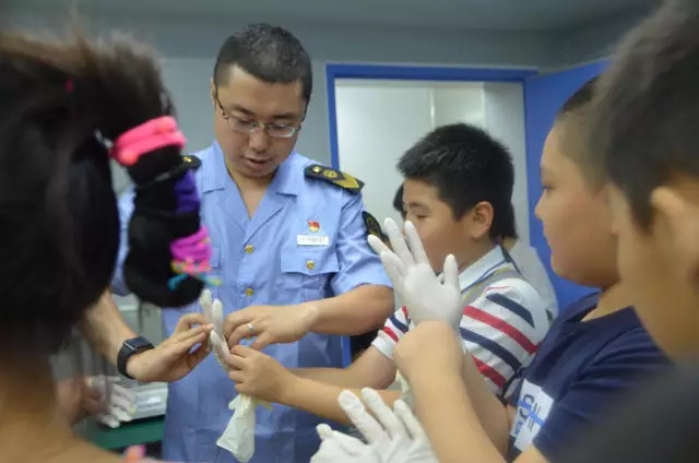 工作人員首先分發(fā)給孩子們做快檢用的一次性手套。哇哦,看我們的姜所長一臉慈愛地教孩子們怎么戴手套,再戴上口罩,全幅武裝好啦~