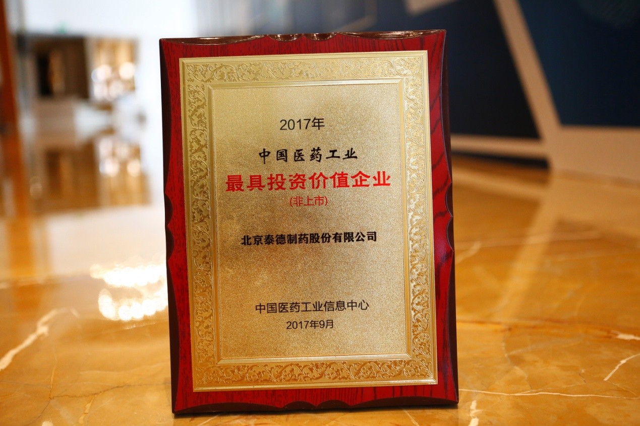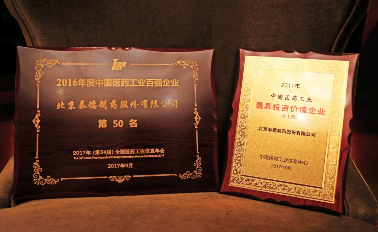 2017年9月2日, 由中國(guó)醫(yī)藥工業(yè)信息中心主辦,以“匯智 重構(gòu) 跨越”為主題的第34屆“全國(guó)醫(yī)藥工業(yè)信息年會(huì)暨2016年度中國(guó)醫(yī)藥工業(yè)百強(qiáng)榜單發(fā)布”在四川省成都隆重召開。本次大會(huì)正式發(fā)布了備受矚目的“2016年度中國(guó)醫(yī)藥工業(yè)百強(qiáng)企業(yè)”榜單,北京泰德制藥股份有限公司(以下簡(jiǎn)稱泰德制藥)成功入選該榜單,位列全國(guó)第50位,并獲評(píng) “2017年中國(guó)醫(yī)藥工業(yè)最具投資價(jià)值企業(yè)”。