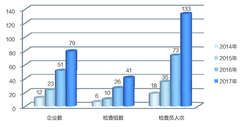 2014年~2017年,國(guó)家食藥監(jiān)總局飛行檢查的企業(yè)數(shù)、檢查組數(shù)和檢查員人次數(shù)增長(zhǎng)明顯。其中,檢查企業(yè)數(shù)從2014年的12家,增長(zhǎng)到2017年的79家;檢查員人次數(shù)從2014年的18人次,增加到2017年的133人次。
