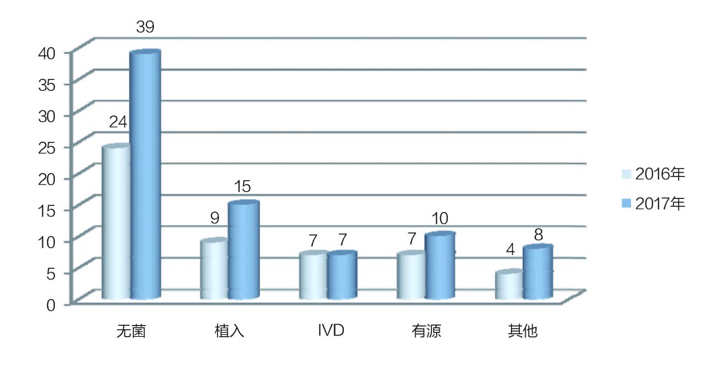 2017年的79家器械生產(chǎn)企業(yè)從品種分配來看,生產(chǎn)無菌醫(yī)療器械產(chǎn)品的占39家,植入性醫(yī)療器械15家,體外診斷試劑7家,有源醫(yī)療器械產(chǎn)品10家,其他類8家;2016年這幾類品種分別為24家、9家、7家、7家和4家(見圖2)。“可以看出,2016年和2017年無菌器械產(chǎn)品都是飛檢的重中之重?!蓖鯋劬f。