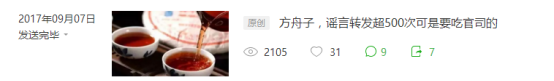 2017年9月,方舟子發(fā)表了一篇名為《喝茶能防癌還是致癌?》的微信文章,稱(chēng):普洱茶含強(qiáng)致癌物黃曲霉毒素,引起業(yè)界與消費(fèi)者的熱議。