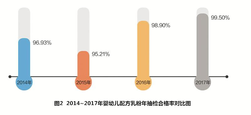 新政在防范嬰幼兒配方乳粉質(zhì)量安全風(fēng)險、從源頭提升嬰幼兒配方乳粉質(zhì)量安全總體水平上同樣發(fā)揮了積極的促進作用。為進一步加強嬰幼兒配方乳粉質(zhì)量監(jiān)管,從2016年1月開始,國家食藥監(jiān)總局對嬰幼兒配方乳粉實行“月月抽檢、月月公開”。據(jù)國家食藥監(jiān)總局官網(wǎng)發(fā)布的嬰幼兒配方乳粉國家專項監(jiān)督抽查結(jié)果,其全年抽檢合格率由2014年的96.93%上升至2016年的98.90%,到2017年,嬰幼兒配方乳粉樣品全年抽查不合格樣品僅有5批次,抽檢合格率達99.50%(詳見圖2),嬰幼兒配方乳粉質(zhì)量總體進一步提升。