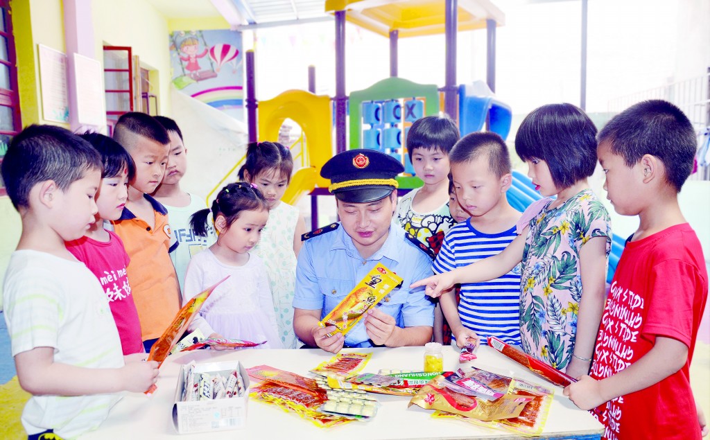 圖為5月28日,監(jiān)管人員在于都縣向仙下鄉(xiāng)小精靈幼兒園小朋友講解食品知識(shí)。/攝 王雨林
