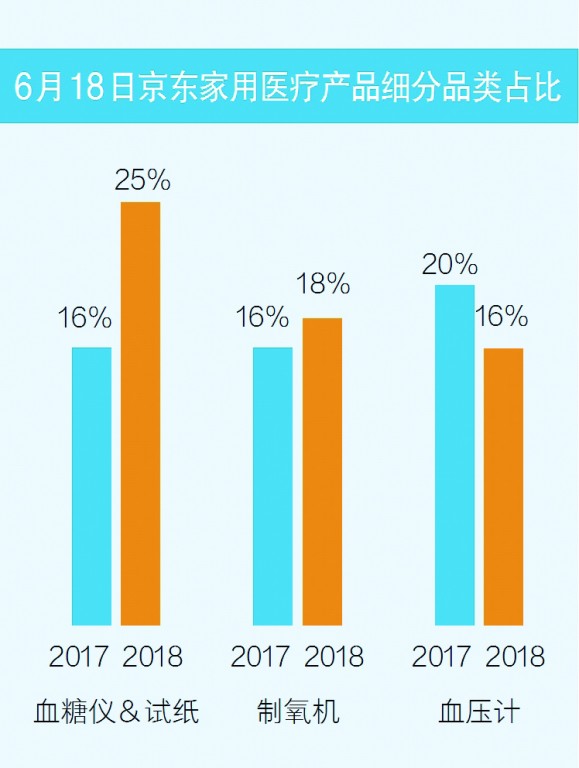 在父親節(jié)和端午節(jié)的雙重助力下,禮孝長輩的醫(yī)藥健康產(chǎn)品成為銷售爆款。6月1~18日,京東醫(yī)藥家用醫(yī)療產(chǎn)品銷售增量顯著。以銷售額來看,魚躍、歐姆龍品牌產(chǎn)品銷售額雙雙突破5000萬元,血壓計品類累計銷售額達5700余萬元,血糖儀品類銷售額同比增長超過200%。