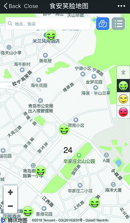 去年,青島市啟動了“食安笑臉地圖”一期工程。該地圖采用互聯(lián)網(wǎng)大數(shù)據(jù)技術(shù)研發(fā)設(shè)計,涵蓋查看、搜索、導(dǎo)航等功能,首批錄入食品安全量化等級最高的“大笑”餐飲服務(wù)單位4251家和學生校外就餐的“小飯桌”1005家。消費者可以通過“食安笑臉地圖”隨時查看餐飲服務(wù)單位的食品安全等級,并經(jīng)導(dǎo)航前往心儀的飯店?!笆嘲残δ樀貓D”上線公測以來,得到了青島市民的積極參與和互動,社會反響良好。