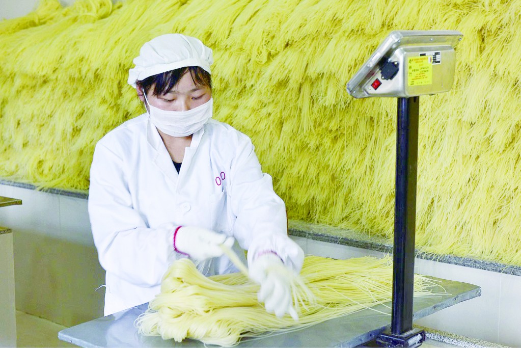圖為張家界市“放心早餐產(chǎn)業(yè)園”內(nèi)米粉生產(chǎn)企業(yè)員工正在為米粉稱(chēng)重。