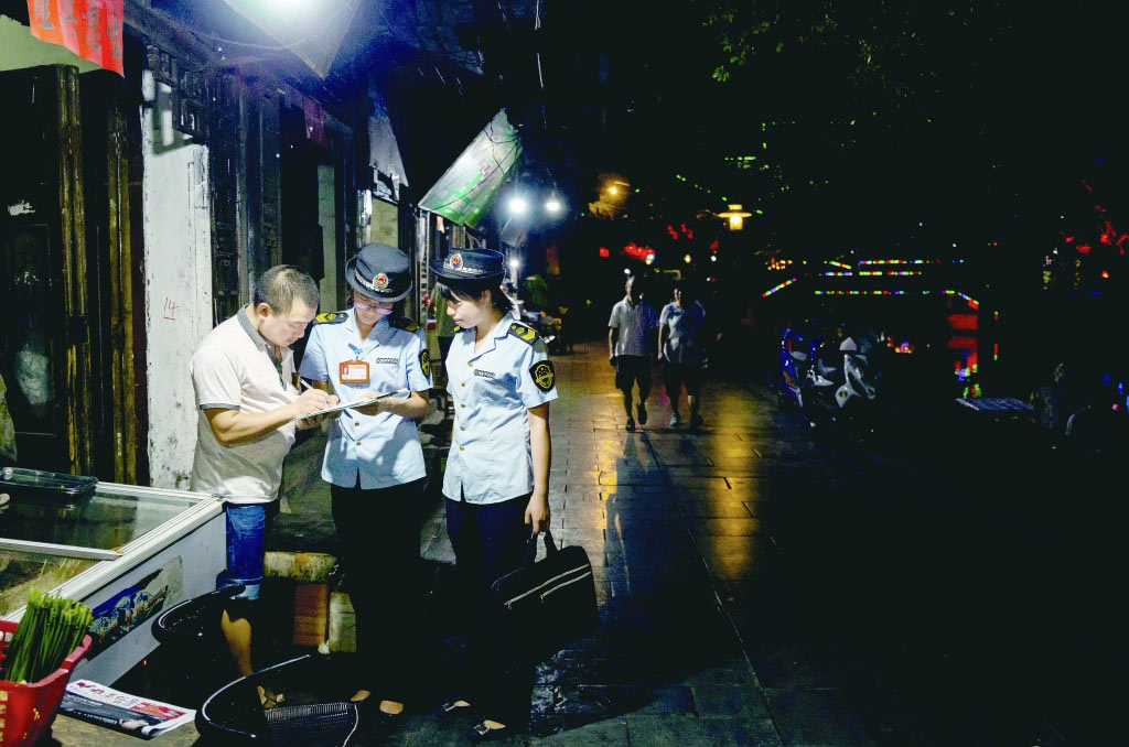 8月2日晚上9點(diǎn),悶熱的空氣里沒(méi)有一絲風(fēng)。廣西壯族自治區(qū)興安縣興安鎮(zhèn)食品藥品監(jiān)管所執(zhí)法人員董秀月(中)與唐穎(右)還在對(duì)前段時(shí)間夜宵攤的專(zhuān)項(xiàng)整治行動(dòng)進(jìn)行回頭看檢查。