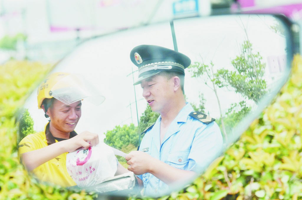 連日來(lái),江蘇省鹽城市持續(xù)高溫天氣。鹽城市食品藥品監(jiān)管局城南分局執(zhí)法人員始終堅(jiān)持奮戰(zhàn)一線,對(duì)網(wǎng)絡(luò)餐飲服務(wù)第三方平臺(tái)配送業(yè)務(wù)進(jìn)行專(zhuān)項(xiàng)檢查。8月10日,執(zhí)法人員葛慶國(guó)(右)和同事走上街頭,檢查送餐人員健康證、配送容器清潔情況等,確保配送過(guò)程中食品不受污染。