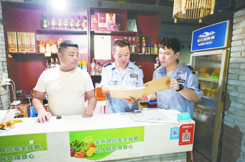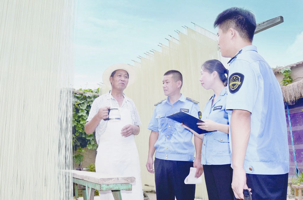 8月9日,山東省高唐縣地表溫度38℃。高唐縣食品藥品監(jiān)管局執(zhí)法人員董吉萊(左二)、李巖(左三)、趙飛(右一)頂著烈日來(lái)到向陽(yáng)花開(kāi)度假村“墜面坊”開(kāi)展日常監(jiān)督檢查。近期該局正在開(kāi)展“在一線助規(guī)范”活動(dòng),幫扶“三小”業(yè)戶對(duì)標(biāo)規(guī)范,進(jìn)一步提升食品安全保障能力。