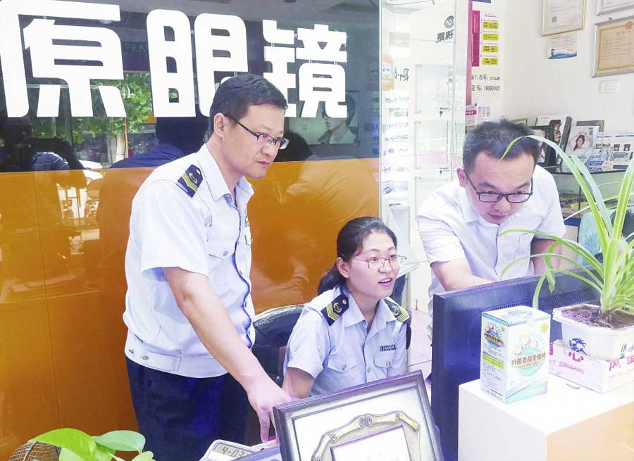 檢查人員正在調(diào)取濟南市長清區(qū)中原眼鏡店經(jīng)營的隱形眼鏡的相關記錄
