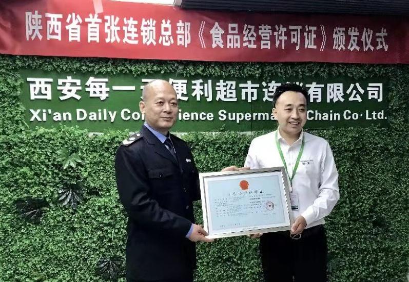 每一天便利超市連鎖有限公司董事長張培彥從陜西省食藥監(jiān)局副局長任彥保手中接過連鎖總部《食品經(jīng)營許可證》。