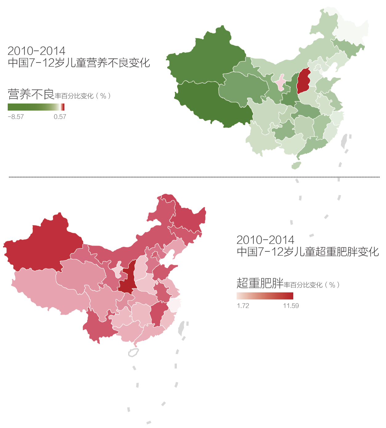 圖表說(shuō)明:將2014年的各省營(yíng)養(yǎng)不良率或超重肥胖率減去2010年的各省營(yíng)養(yǎng)不良率或超重肥胖率得出的差值繪制成地圖。