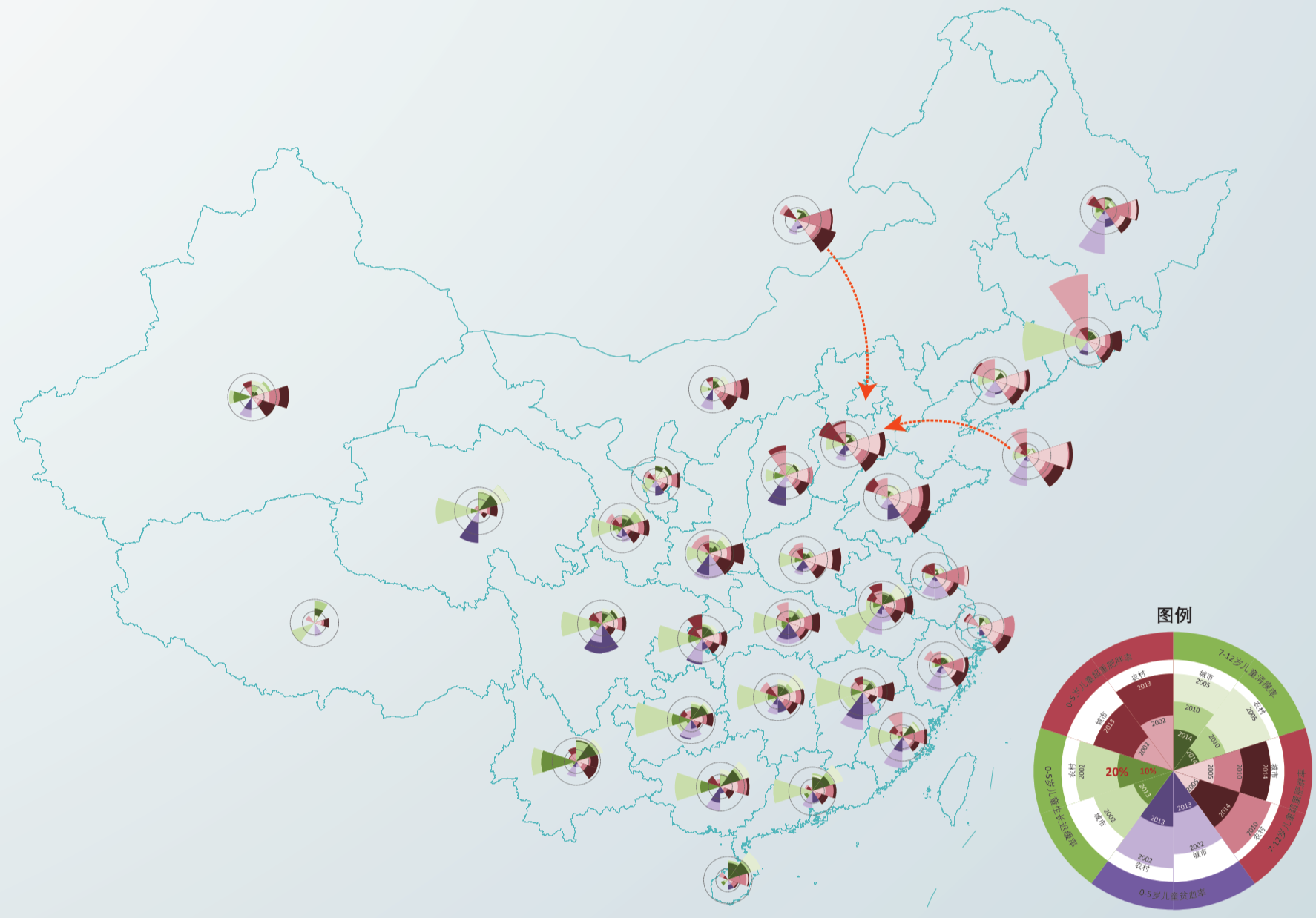 圖表說(shuō)明:將0—5歲的各省數(shù)據(jù)(2002、2013)和7—12歲各省數(shù)據(jù)(2005、2010、2014)綜合進(jìn)南丁格爾玫瑰圖,圖例順時(shí)針分別為7—12歲兒童消瘦率(分城鄉(xiāng))、7—12歲超重肥胖率(分城鄉(xiāng))、0—5歲兒童貧血率(分城鄉(xiāng))、7—12歲生長(zhǎng)遲緩率和超重肥胖率(分城鄉(xiāng))。圖例顏色越深代表數(shù)據(jù)年份越新。圖例中兩個(gè)圓環(huán)從內(nèi)向外分別標(biāo)記為10%和20%。