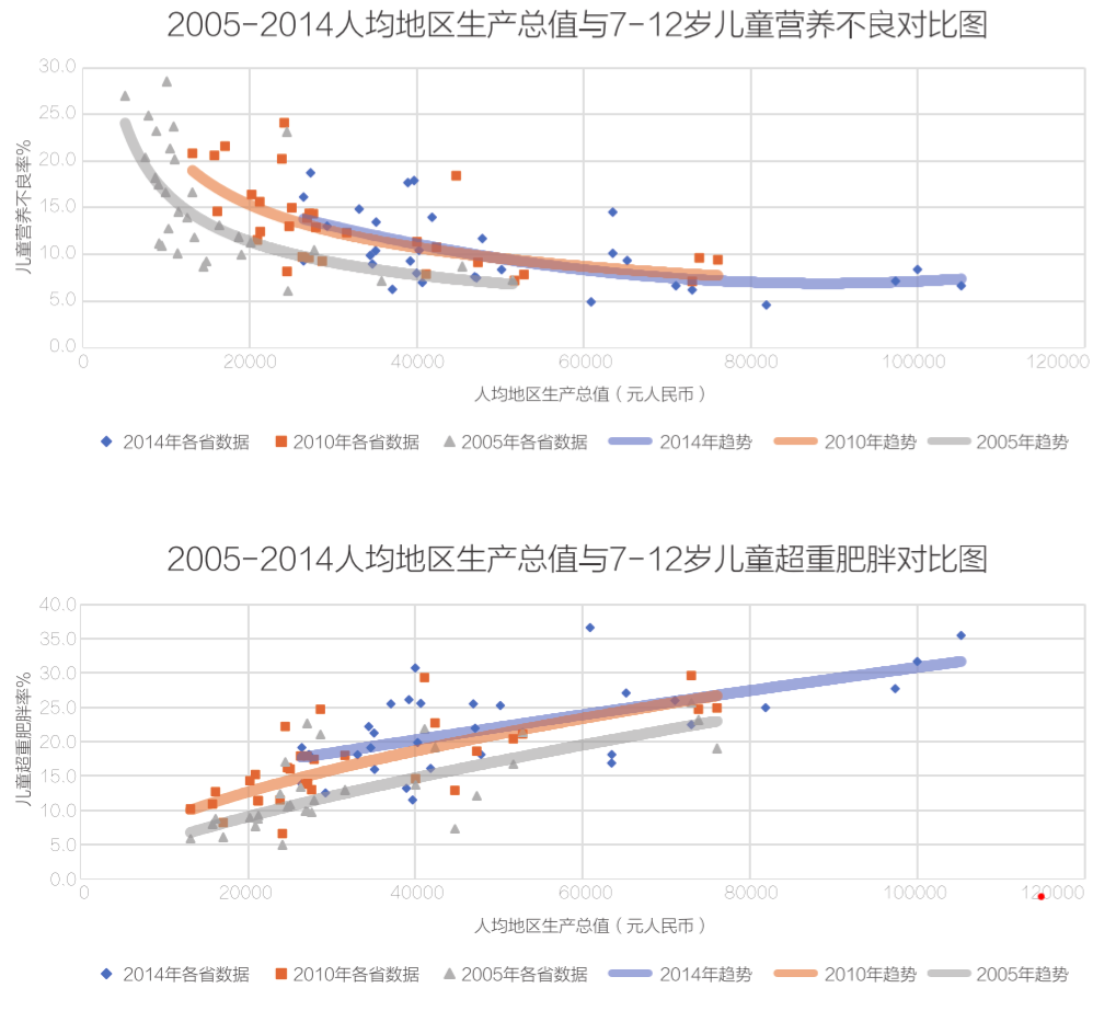 中國(guó)7—12歲兒童的超重肥胖率與地區(qū)經(jīng)濟(jì)發(fā)展成正比關(guān)系,主要集中在人均GDP較高的東部地區(qū),整體隨經(jīng)濟(jì)發(fā)展而上升;營(yíng)養(yǎng)不良率與地區(qū)經(jīng)濟(jì)發(fā)展成反比關(guān)系,檢出主要集中在人均GDP較低的西南和西北地區(qū),整體隨經(jīng)濟(jì)發(fā)展而下降。