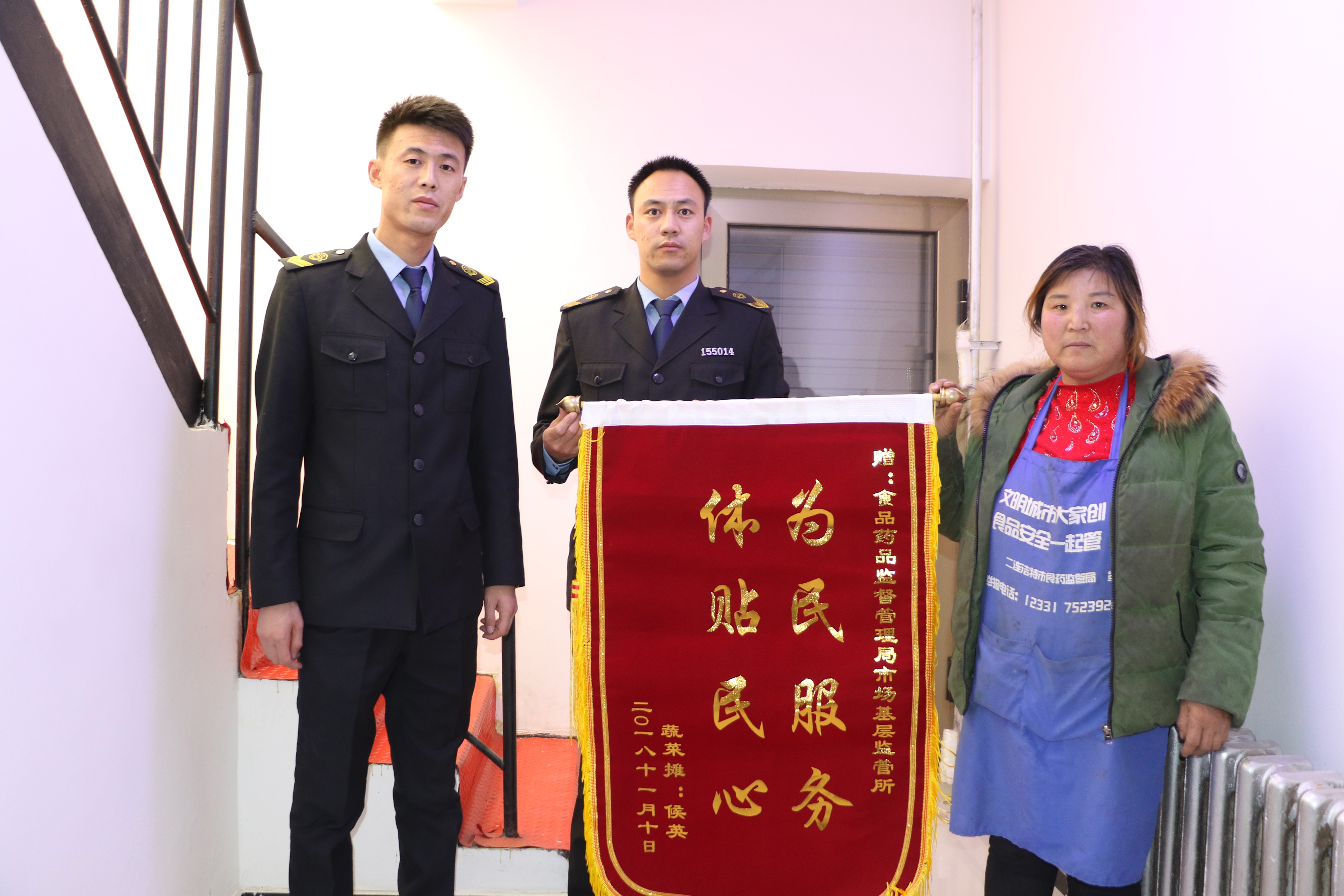 中國(guó)食品藥品網(wǎng) 記者 楊燕 通訊員 王要強(qiáng) 報(bào)道 11月12日,為感謝二連浩特市食藥監(jiān)管局市場(chǎng)基層監(jiān)管所工作人員熱情周到服務(wù),寶鼎菜市場(chǎng)侯英蔬菜攤和深香園熟食店先后將錦旗送到該所?!拔覀儾粫?huì)做食品安全檔案,麻煩了你們多次,真是太感謝你們熱情周到的服務(wù)了!”侯英蔬菜攤負(fù)責(zé)人連連道謝。