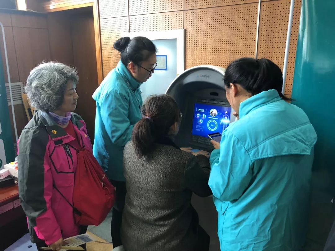 把雙手放到小機(jī)器人的檢測儀圓盤上,根據(jù)電腦提示操作,只要微信關(guān)注就能檢測出居民的健康情況,消化系統(tǒng)、神經(jīng)系統(tǒng)、腦力、睡眠等相關(guān)的健康指標(biāo)一下子就會(huì)出現(xiàn)在你的微信上?!罢媸巧衿姘。瓦@么一個(gè)小機(jī)器人就能看病啦,還這么快就出來體側(cè)報(bào)告,如今的科技越來越超前?!爆F(xiàn)場居民李大爺興奮看著這兩個(gè)小機(jī)器人。