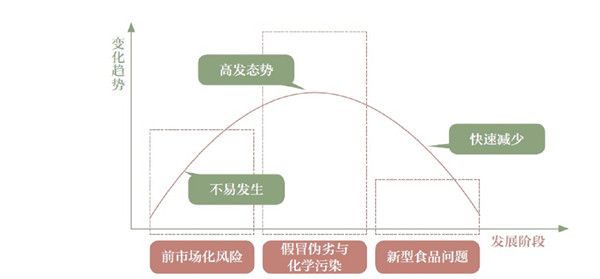 注:圖中實(shí)曲線代表不同發(fā)展階段食品安全問題總量變化趨勢(shì),虛線方框代表對(duì)應(yīng)的主要食品安全問題類型(資料來源:作者整理)