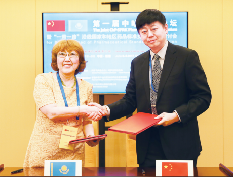 2017年6月,國家藥典委員會秘書長張偉(右)與哈薩克斯坦共和國衛(wèi)生部國家藥品醫(yī)療器械及醫(yī)療設(shè)備中心藥典部主任