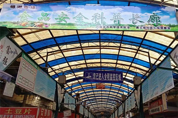 圖為六盤水市創(chuàng)建國(guó)家食品安全示范城市以來(lái),明湖市科協(xié)與市市場(chǎng)監(jiān)管局聯(lián)合建設(shè)于該市鐘山區(qū)黃土坡社區(qū)明湖農(nóng)貿(mào)市場(chǎng)的“食品安全科普長(zhǎng)廊”