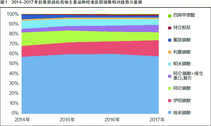 中國藥學(xué)會數(shù)據(jù)顯示,2014~2017年,抗骨質(zhì)疏松藥物在樣本醫(yī)院的復(fù)合增長率為0.9%,總體市場規(guī)模約為50億元。市場銷售額排名前5位的品種依次為:唑來膦酸、伊班膦酸、阿侖膦酸、阿侖膦酸+維生素D3復(fù)方、帕米膦酸。其中,唑來膦酸處于相對主導(dǎo)位置,市場份額基本穩(wěn)定在60%左右;伊班膦酸、阿侖膦酸+維生素D3復(fù)方的市場份額呈增長趨勢;阿侖膦酸、帕米膦酸呈下降勢頭。