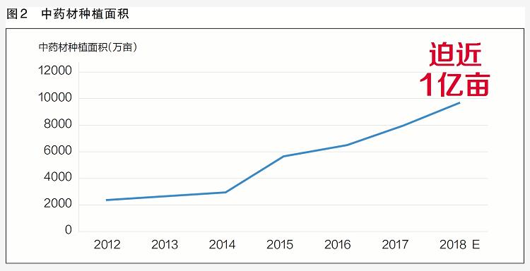 經(jīng)過30多年的發(fā)展,我國藥材種植生產(chǎn)初步完成集約化、規(guī)模化,南北藥材區(qū)劃基本形成。當前,全國中藥材種植面積已接近1億畝(見圖2),藥材供給大大超出了需求,但因其質(zhì)量千差萬別,導(dǎo)致部分優(yōu)質(zhì)品種往往供不應(yīng)求。