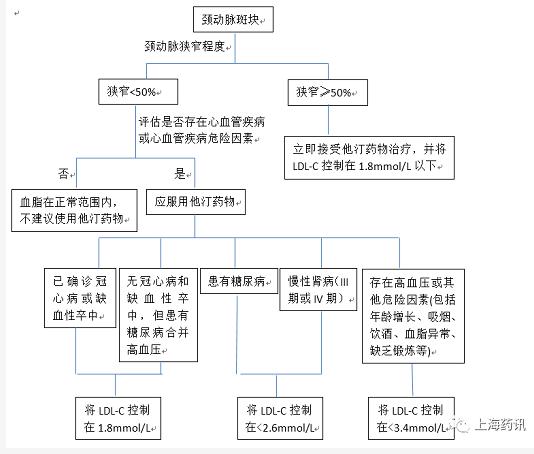 ◆若頸動(dòng)脈斑塊導(dǎo)致了頸動(dòng)脈明顯狹窄(狹窄≥50%),其處理原則與確診冠心病或缺血性卒中相同(均屬于動(dòng)脈粥樣硬化性心血管疾?。?,應(yīng)該立即接受他汀治療,將LDL-C控制在1.8mmol/L以下,并且多數(shù)患者還應(yīng)該考慮接受阿司匹林抗血小板治療。