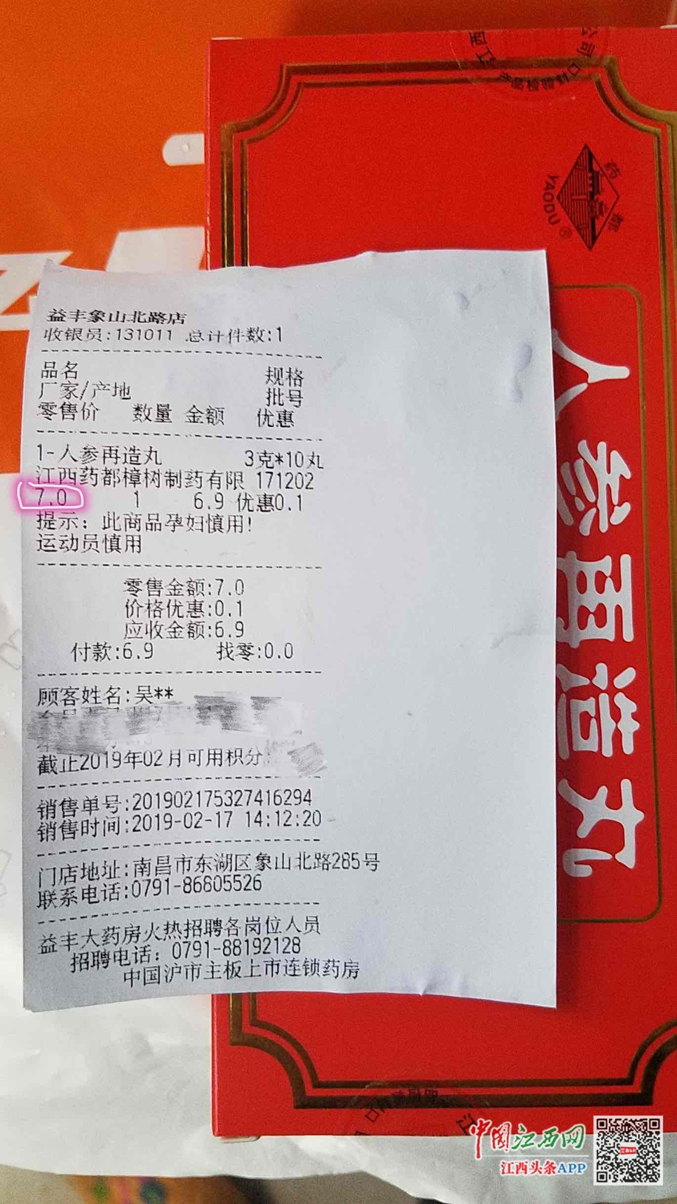 據(jù)吳先生介紹,2月17日下午,他在疊山路與象山北路口的黃慶仁棧華氏大藥房為家人購買處方藥“人參再造丸”,吳先生以一盒15.6元的價(jià)格購買了兩盒,之后在距離不到100米的益豐大藥房象山北路店購買同一生產(chǎn)廠家生產(chǎn)的同一種藥品時(shí),僅以7元的單價(jià)就購買到了一盒。記者了解到,該藥由江西藥都樟樹制藥有限公司生產(chǎn),規(guī)格為一盒3g*10丸。