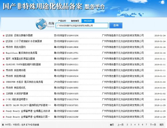 在國(guó)產(chǎn)非特殊用途化妝品備案信息庫(kù)中,綠色春天一家就負(fù)責(zé)了全國(guó)各地不同品牌、不同種類的多達(dá) 704 種化妝品的生產(chǎn)。僅在2019 年1月,就備案了吉林、廣東、北京、上海各種不同品牌的11種化妝品。