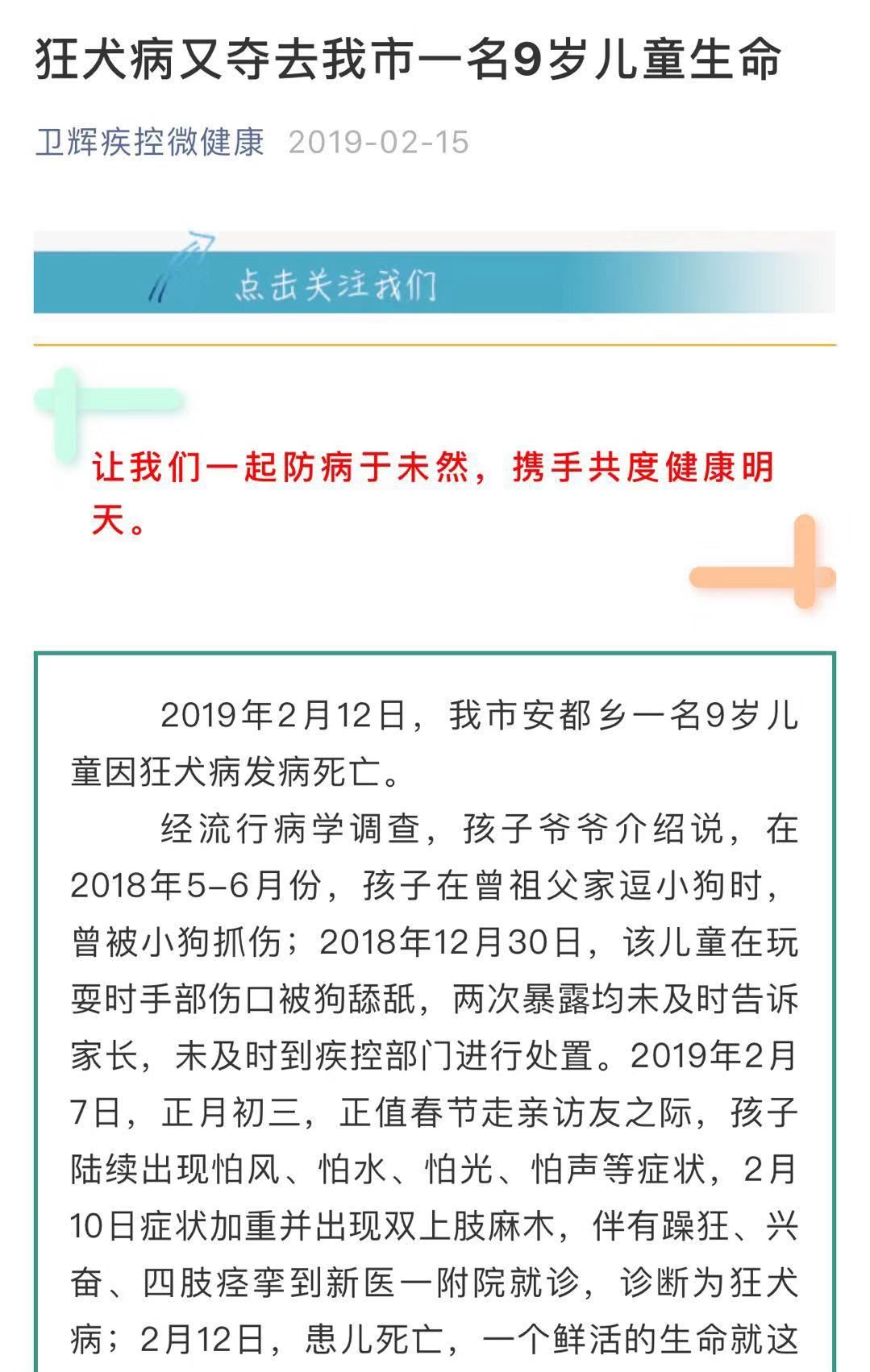 內(nèi)容顯示,在2018年5-6月份,男孩曾被小狗抓傷,2018年12月30日,該兒童在玩耍時手部傷口被狗舔舐,兩次暴露均未及時告訴家長,未及時到疾控部門進行處置。2019年2月7日,孩子陸續(xù)出現(xiàn)怕風(fēng)、怕水、怕光、怕聲等癥狀,2月10日癥狀加重并出現(xiàn)雙上肢麻木,伴有躁狂、興奮、四肢痙攣到新醫(yī)一附院就診,診斷為狂犬病,2月12日,患兒死亡。