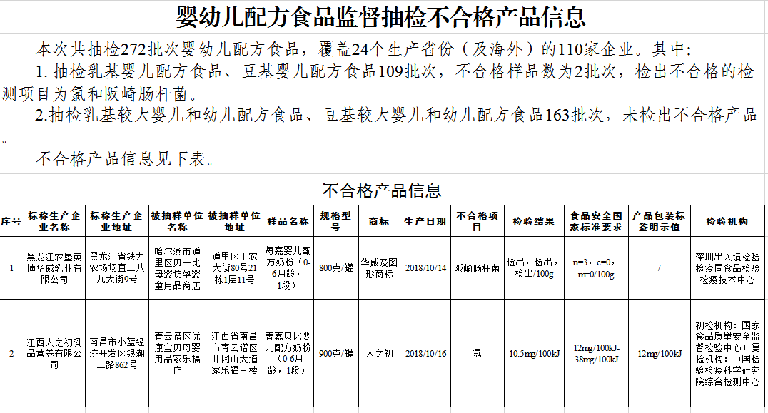 市場監(jiān)管總局通告30批次食品不合格 每嘉、菁嘉貝比嬰配奶粉上榜