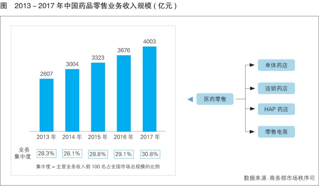 商務部發(fā)布的《2017年藥品流通行業(yè)運行統(tǒng)計分析報告》顯示,2017年,我國藥品零售市場整體規(guī)模達4003億元,扣除不可比因素同比增長9%。預計到2020年,我國藥品零售市場整體規(guī)模有望達到5200億元。