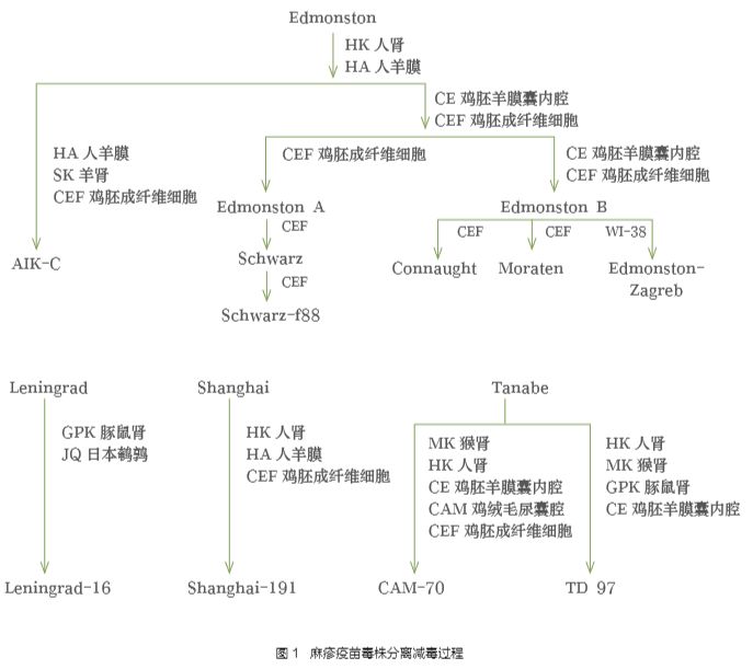 1954 年,Ender 和 Peebles 首次分離獲得麻疹病毒。1963年,美國批準滅活麻疹疫苗銷售,生產(chǎn)毒株為 Edmonston株,但由于滅活疫苗免疫原性差,保護時間短,且接種者在暴露野生型麻疹病毒時易發(fā)生非典型性麻疹綜合征,因此在1967年后停止了滅活麻疹疫苗的使用改為使用減毒活疫苗,生產(chǎn)毒株為Edmonston 衍生株(表 1、2)。俄國為自主分離獲得的 Leningrad 株的衍生株,日本采用的是由Tanabe株衍生出來的CAM-70株與TD97株。1960年,我國開始研制麻疹減毒活疫苗,生產(chǎn)毒株為滬191、長47等(圖 1)。