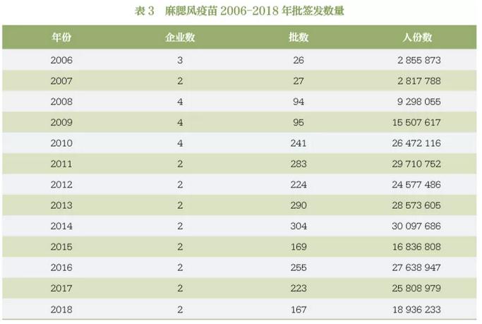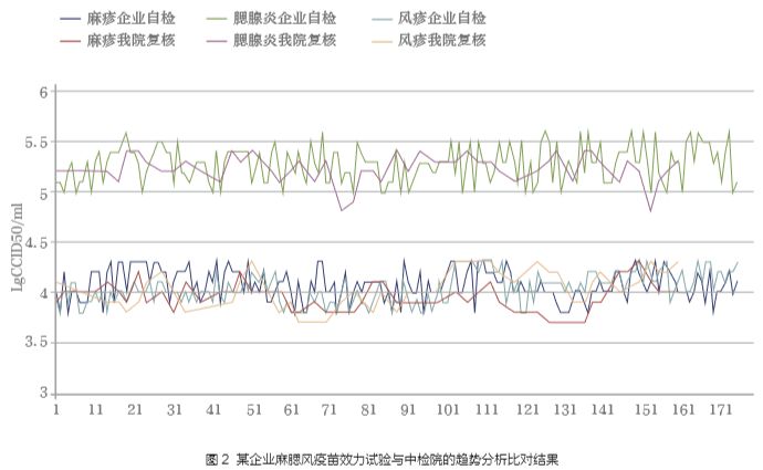 我國自 2001 年起對麻疹及含麻疹成分的聯(lián)合疫苗實行批簽發(fā)審批制度,即生產(chǎn)企業(yè)將每批次生產(chǎn)的疫苗產(chǎn)品在自檢合格的基礎上抽樣送檢,中國食品藥品檢定研究院(后簡稱中檢院)對其送檢的產(chǎn)品進行全部批次的資料審核與按比例抽驗關鍵質(zhì)控項目,抽驗過程及全部批次的無菌與異常毒性實驗由各地方授權藥檢所協(xié)助完成,在中檢院依據(jù)各企業(yè)批準的企業(yè)標準與《中國藥典》的要求對樣品進行檢定合格后,合并地方藥檢所安全性報告最終發(fā)出該批制品的批簽發(fā)合格證,產(chǎn)品予以上市銷售。由于單價麻疹疫苗在計劃免疫中逐漸退出舞臺,取而代之的是含麻疹成分的二聯(lián)與三聯(lián)疫苗。自 2006 年至2018年12年間中檢院共批簽發(fā)麻疹腮腺炎風疹聯(lián)合減毒活疫苗 2398 批次,共計 2 億 6 千萬人份(表 3)(單價疫苗與二聯(lián)疫苗未列入統(tǒng)計)。在批簽發(fā)過程中,中檢院密切關注效力、安全等關鍵性質(zhì)量指標,按照WHO建議對企業(yè)自檢結果與批簽發(fā)試驗結果進行趨勢分析(圖 2),一旦發(fā)現(xiàn)異常,迅速反應,確保在我國上市使用的麻疹及相關疫苗是安全有效的,確保麻疹的有效免疫覆蓋率 [4]。