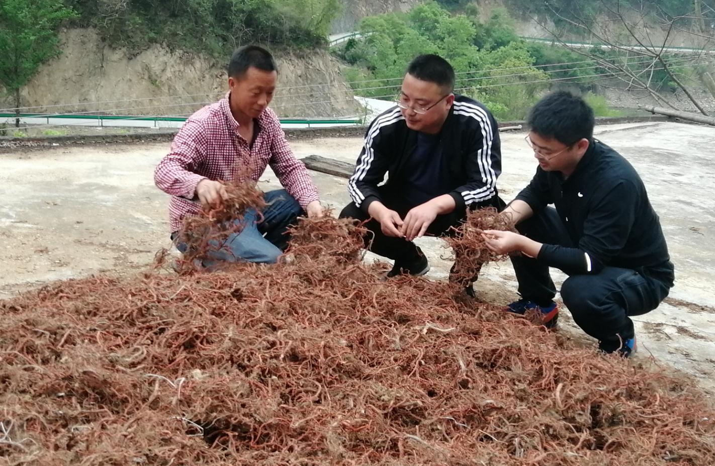 高坎村村民吳先德和扶貧干部一起查看丹參晾曬情況。(陜西省藥監(jiān)局供圖)
