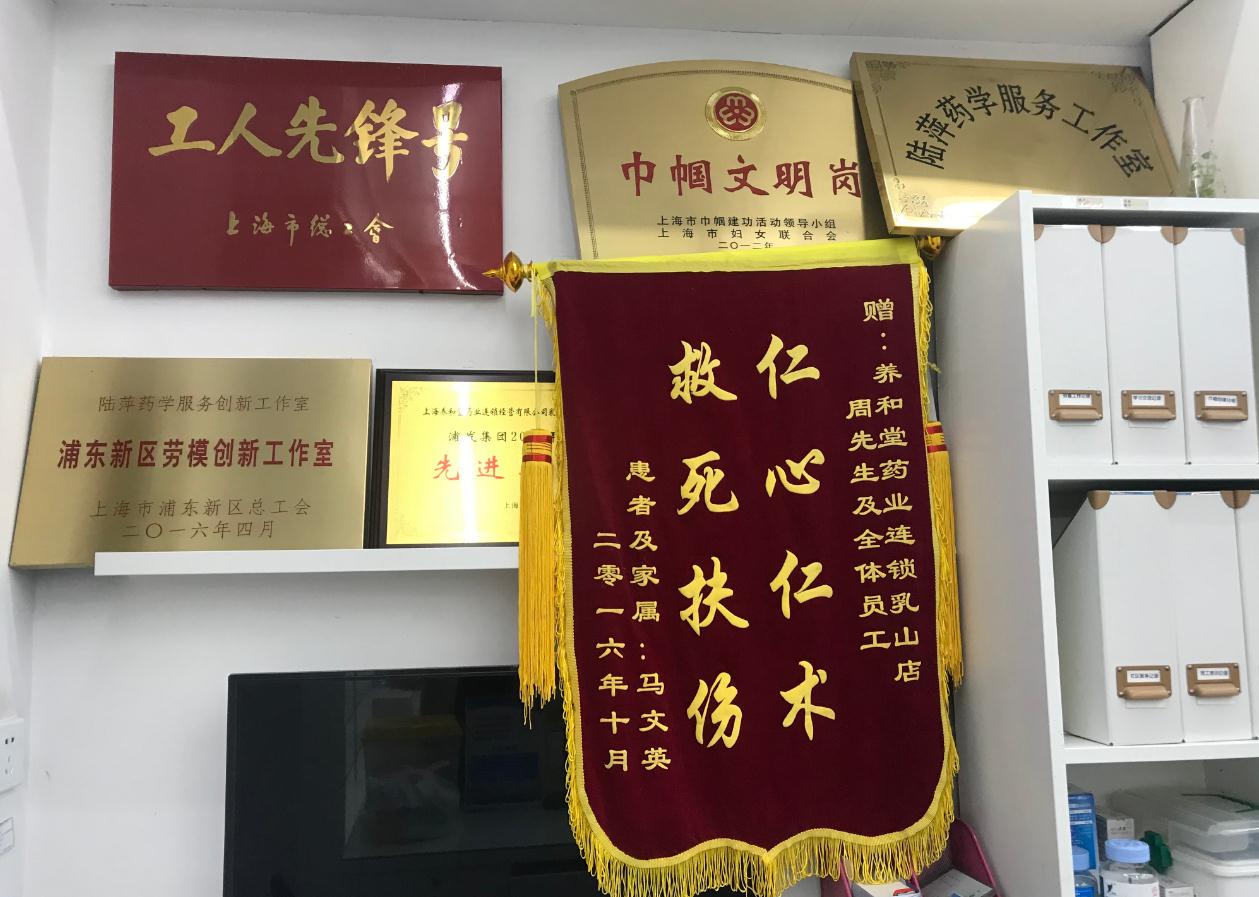 陸萍既是上海養(yǎng)和堂藥業(yè)連鎖經(jīng)營有限公司乳山店的質(zhì)量負責(zé)人,也是這里的首席執(zhí)業(yè)藥師。在門店一角“陸萍藥學(xué)服務(wù)工作室”的柜子上滿滿的牌匾——“工人先鋒號”“巾幗文明崗”“浦東新區(qū)勞模創(chuàng)新工作室”……