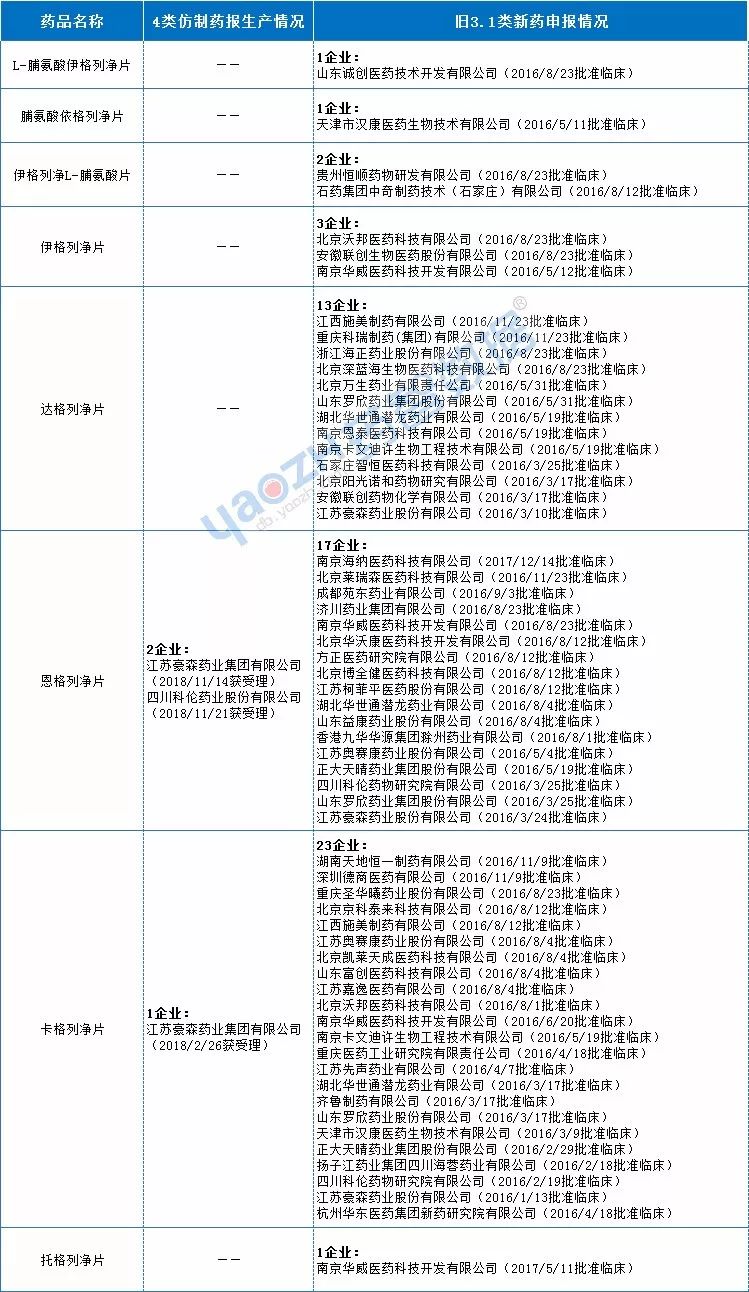 此外,稍后上市的那格列汀、曲格列汀、替格列汀3個品種也有企業(yè)進行了申報,其中于2015年上市的曲格列汀竟有29家企業(yè)進行了舊3.1類新藥申報,且申報時間基本集中在2015年,獲批臨床集中在2016年,其中不乏正大天晴、海正、石藥、齊魯?shù)葘嵙^強的企業(yè)。