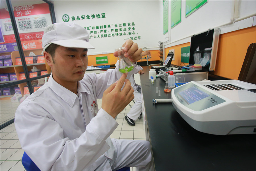 淮安大潤(rùn)發(fā)超市食品安全檢驗(yàn)人員進(jìn)行蔬菜農(nóng)殘檢測(cè)
