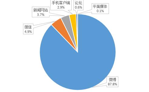 以5月2日~5月16日為監(jiān)測(cè)時(shí)間段,統(tǒng)計(jì)不同媒體平臺(tái)報(bào)道量。從圖2可以看出,占比較高的信息平臺(tái)依次為微博、微信和新聞網(wǎng)站,占比分別為87.8%、4.9%、3.7%。