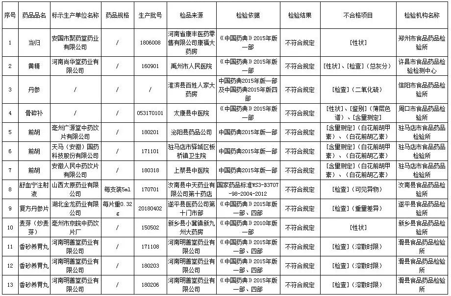 一、經(jīng)鄭州市食品藥品檢驗(yàn)所檢驗(yàn),標(biāo)示為安國(guó)市聚藥堂藥業(yè)有限公司生產(chǎn)的當(dāng)歸(批號(hào)1806008)不合格,不合格項(xiàng)目為性狀。經(jīng)許昌市食品藥品檢驗(yàn)檢測(cè)中心檢驗(yàn),標(biāo)示為河南尚華堂藥業(yè)有限公司生產(chǎn)的黃精(批號(hào)160901)不合格,不合格項(xiàng)目為性狀、總灰分。經(jīng)信陽(yáng)市食品藥品檢驗(yàn)所檢驗(yàn),檢品來(lái)源為淮濱縣百姓人家大藥房的丹參不合格,不合格項(xiàng)目為二氧化硫。經(jīng)周口市食品藥品檢驗(yàn)所檢驗(yàn),檢品來(lái)源為太康縣中醫(yī)院的骨碎補(bǔ)(批號(hào)053170101)不合格,不合格項(xiàng)目為性狀、薄層色譜、含量測(cè)定。經(jīng)駐馬店市食品藥品檢驗(yàn)所檢驗(yàn),標(biāo)示為亳州廣源堂中藥飲片有限公司生產(chǎn)的前胡(批號(hào)180201)不合格,標(biāo)示為天馬(安徽)國(guó)藥科技股份有限公司生產(chǎn)的前胡(批號(hào)171101)不合格,標(biāo)示為安徽人民中藥飲片有限公司生產(chǎn)的前胡(批號(hào)180318)不合格,不合格項(xiàng)目均為含量測(cè)定。經(jīng)汝南縣食品藥品檢驗(yàn)所檢驗(yàn),標(biāo)示為山西太原藥業(yè)有限公司生產(chǎn)的舒血寧注射液(批號(hào)170701)不合格,不合格項(xiàng)目為可見異物。經(jīng)遂平縣食品藥品檢驗(yàn)所檢驗(yàn),標(biāo)示為湖北金龍藥業(yè)有限公司生產(chǎn)的復(fù)方丹參片(批號(hào)20180402)不合格,不合格項(xiàng)目為重量差異。經(jīng)新鄉(xiāng)縣食品藥品檢驗(yàn)所檢驗(yàn),標(biāo)示為亳州市京皖中藥飲片廠生產(chǎn)的麥芽(炒麥芽)(批號(hào)150502)不合格,不合格項(xiàng)目為性狀。經(jīng)滑縣食品藥品檢驗(yàn)所檢驗(yàn),標(biāo)示為河南明善堂藥業(yè)有限公司生產(chǎn)的香砂養(yǎng)胃丸(批號(hào)171108、180203、180206)不合格,不合格項(xiàng)目均為溶散時(shí)限。