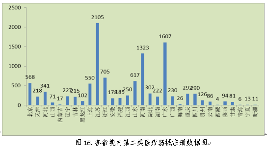 從注冊(cè)情況看,江蘇、廣東、河南、浙江、山東、北京、上海七?。ㄖ陛犑校┳?cè)的境內(nèi)第二類醫(yī)療器械數(shù)量較多。第二類醫(yī)療器械注冊(cè)具體數(shù)據(jù)見表1及圖16。
