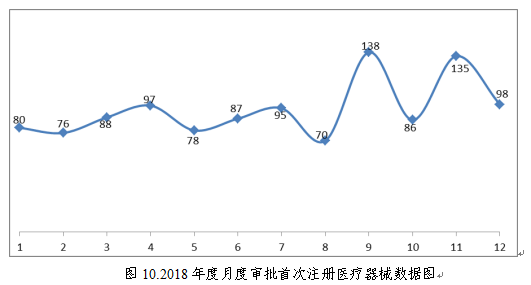 2018年,國家藥品監(jiān)督管理局共批準(zhǔn)醫(yī)療器械首次注冊(cè)1128項(xiàng),月度審批情況見圖10。