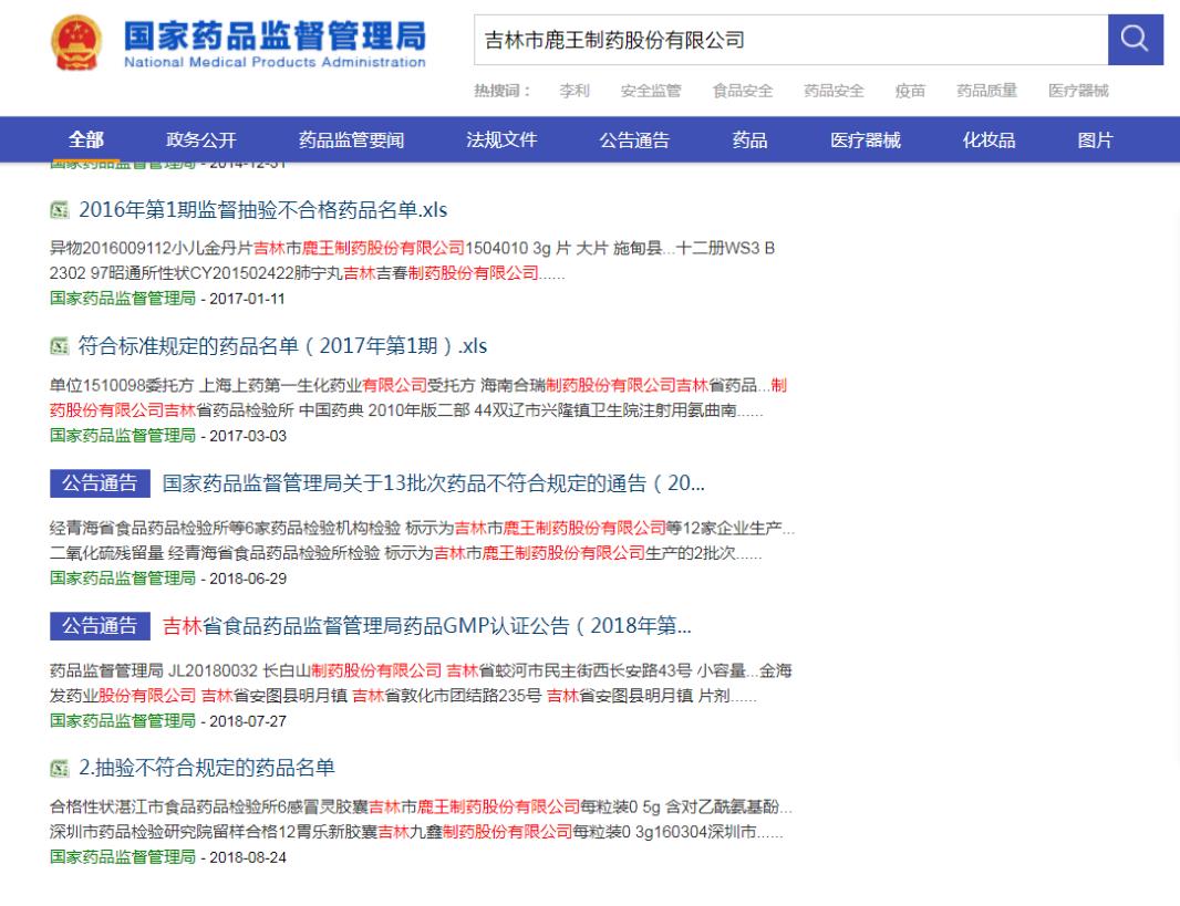記者查閱國(guó)家藥監(jiān)局官網(wǎng)得知,在2018年8月24日、2018年7月3日、2018年2月13日、2017年1月11日國(guó)家藥品監(jiān)管部門(mén)發(fā)布的藥品不合格名單與不符合標(biāo)準(zhǔn)規(guī)定的藥品名單中,都出現(xiàn)了標(biāo)示為吉林市鹿王制藥股份有限公司生產(chǎn)的產(chǎn)品。