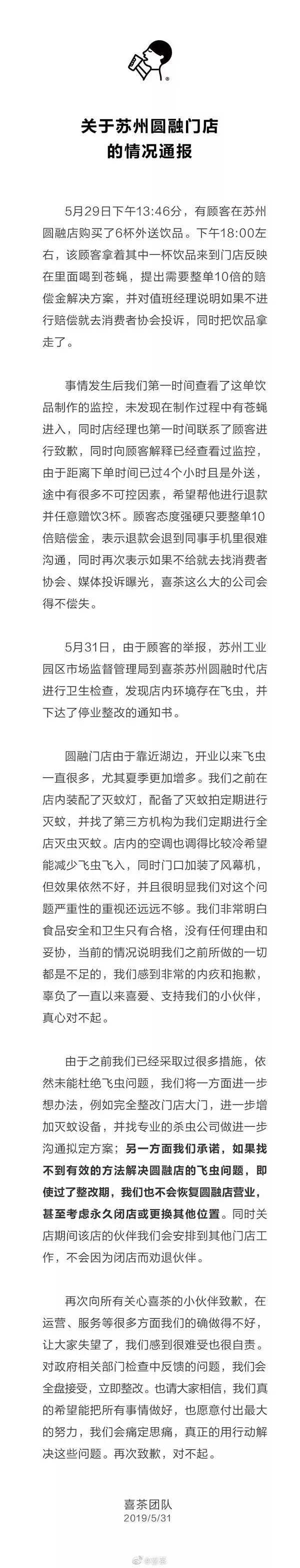 5月31日19時,深圳喜茶投資有限公司官微@喜茶對蘇州圓融店具體情況進(jìn)行了通報,并向廣大消費者道歉。喜茶方面表示,第一時間查看相關(guān)監(jiān)控后,未發(fā)現(xiàn)制作過程中有蒼蠅進(jìn)入,由于上述顧客的購買方式為外送且已過4小時,“途中有很多不可控因素”。喜茶同時認(rèn)為,食品安全和衛(wèi)生只有合格,沒有任何理由和妥協(xié)。如果找不到有效的方法解決圓融店的飛蟲問題,就不會恢復(fù)圓融店營業(yè)甚至考慮永久閉店或更換其他位置。對政府相關(guān)部門檢查中反饋的問題,會全盤接受立即整改。界面新聞、東方財富網(wǎng)等新聞網(wǎng)站,@每日經(jīng)濟新聞、@ 36氪等微博賬號均轉(zhuǎn)載了相關(guān)信息。少量網(wǎng)民對喜茶的道歉并不認(rèn)可,認(rèn)為喜茶是在找借口。