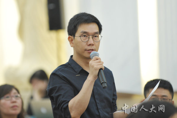 6月29日下午,十三屆全國人大常委會第十一次會議閉幕后,全國人大常委會辦公廳在人民大會堂臺灣廳召開新聞發(fā)布會,全國人大常委會法工委、國家衛(wèi)生健康委、國家藥監(jiān)局等單位有關(guān)負(fù)責(zé)人出席新聞發(fā)布會,共同回答剛剛通過的疫苗管理法的有關(guān)問題。圖為澎湃新聞記者提問。中國人大網(wǎng) 陶宏林 攝