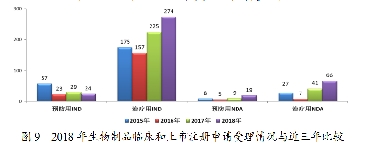 2018年,藥審中心受理1類生物制品創(chuàng)新藥注冊申請106個品種(包括預(yù)防用生物制品6件,治療用生物制品117件,共涉及123件受理號),較2017年增長了62%。其中,受理1類生物制品NDA 9個品種(包括預(yù)防用生物制品2件,治療用生物制品9件,共涉及11件受理號),較2017年增長了4.5倍。